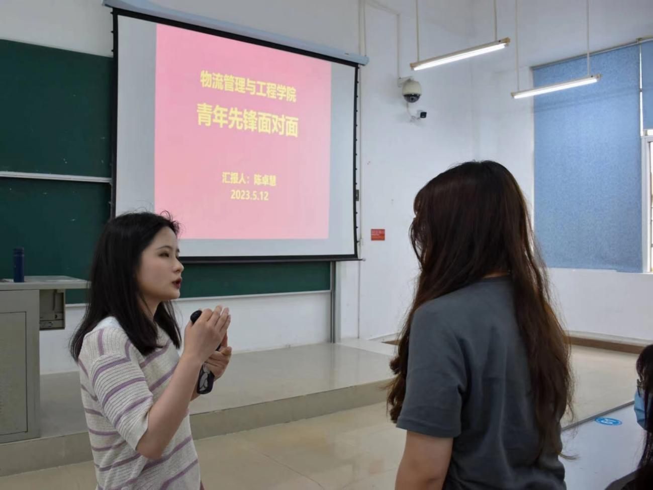 为解决当前学生存在的学业困惑,进一步明确自己的目标和方向,助力学生实现梦想,物流管理与工程学院于2023年5月12日下午于第二教学楼E101举行开展“面对面——助你实现成才梦”主题教育实践活动之“青年先锋面对面”活动。本次分享会由学院辅导员李丁老师主持,学院应届毕业生、十佳大学生陈卓慧担任主讲人,2022级5班团支部成员参与其中。