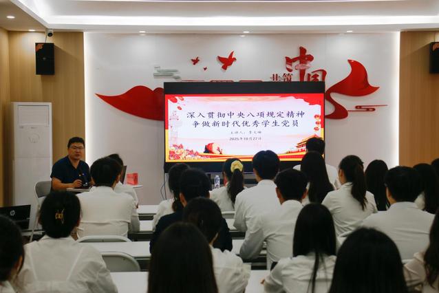 10月27日,学院党委开展政治生活活动,活动由党委组织员闫秋月主持。党委书记李大琳以《深入贯彻中央八项规定精神,争做新时代优秀学生党员》为题主讲党课,结合学生党员成长实际,深入浅出解读中央八项规定精神的时代内涵与实践要求,引导学生党员在思想上政治上行动上同党中央保持高度一致。