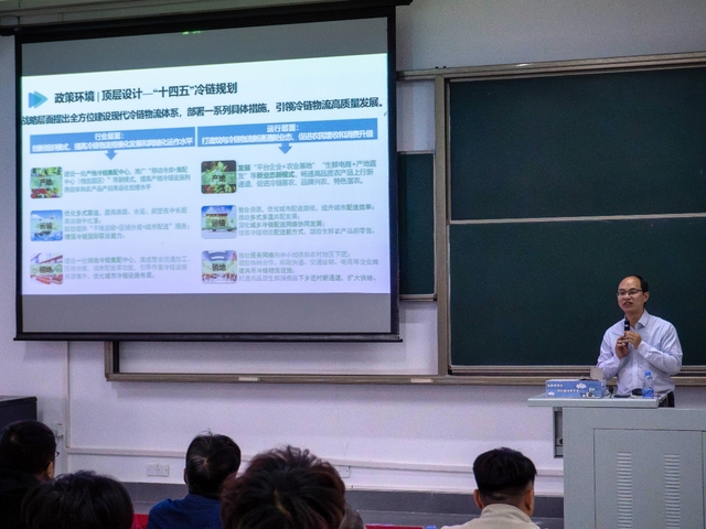 刘广海教授围绕“政策环境解析”“发展现状及趋势”“人才现状”这三大核心模块展开分享。他着重指出,自2008年起,国家相继出台多项专项规划,大力推动绿色低碳体系建设,着力提升物流基础设施的规模化水平。他还结合知名企业案例,表明低空物流、机器人等新技术正重塑行业格局,从业人员需不断学习,以适应行业发展。刘广海进一步分析,当前中国冷链物流市场规模持续扩大,冷链基础设施不断完善,他预测,未来冷链物流将朝着智能化、绿色化、标准化方向发展,如智能温控技术、新能源冷链运输车辆的应用将越来越广泛,同时行业对既懂物流又懂冷链技术的复合型人才需求将大幅增加。他鼓励学生夯实专业基础、提升综合素养,为未来就业做好充分准备。