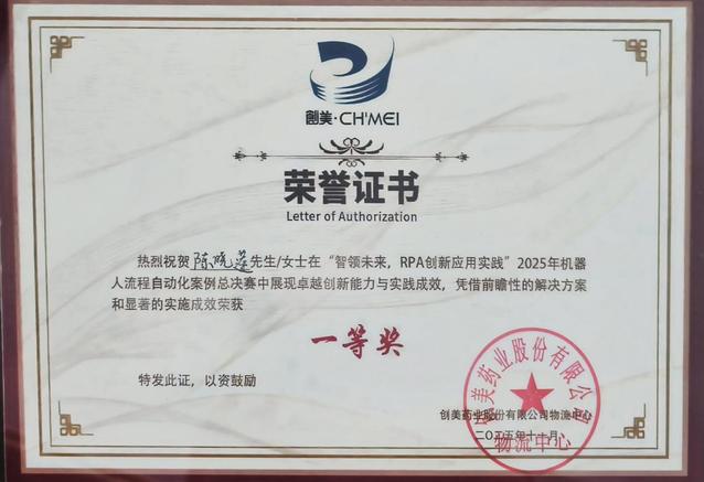 陈晓莲在比赛中展现出了卓越的RPA技术应用能力,凭借其项目“争分夺秒——RPA派单团队”脱颖而出。该方案极大地提高了物流作业的效率,减少了人为错误,为创美药业集团的物流数字化进程注入了新的活力。陈晓莲的创新思路和扎实的技术功底,赢得了评委们的一致好评,最终斩获大赛一等奖。