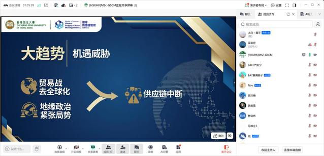 主讲人是香港恒生大学环球供应链管理硕士课程副主任倪冰老师,物流管理与工程学院部分大四与大三学生参加本次宣讲会,活动聚焦高年级学生升学规划与职业发展需求,为有意赴港深造的学子搭建精准对接平台,吸引近百名学生在线参与,互动提问环节反响热烈,有效打通了校企人才培养与升学深造的沟通渠道。